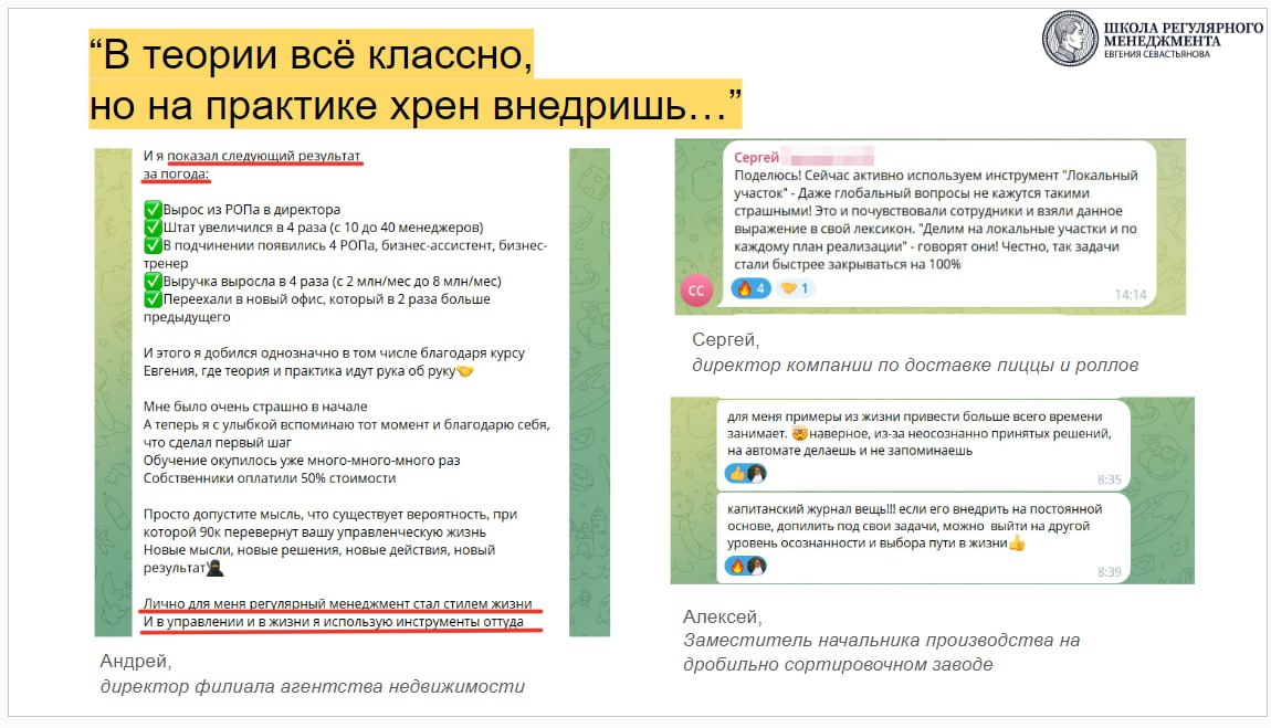 Мысль «в теории всё классно, но на практике хрен внедришь» — это ловушка, которой мы зачастую оправдываем своё бездействие, вместо развития управленских навыков. Тогда как нужно искать обучение, где всё заточено на «внедрить знания на практике так, чтобы улучшились результаты работы сотрудников, подразделения, компании».